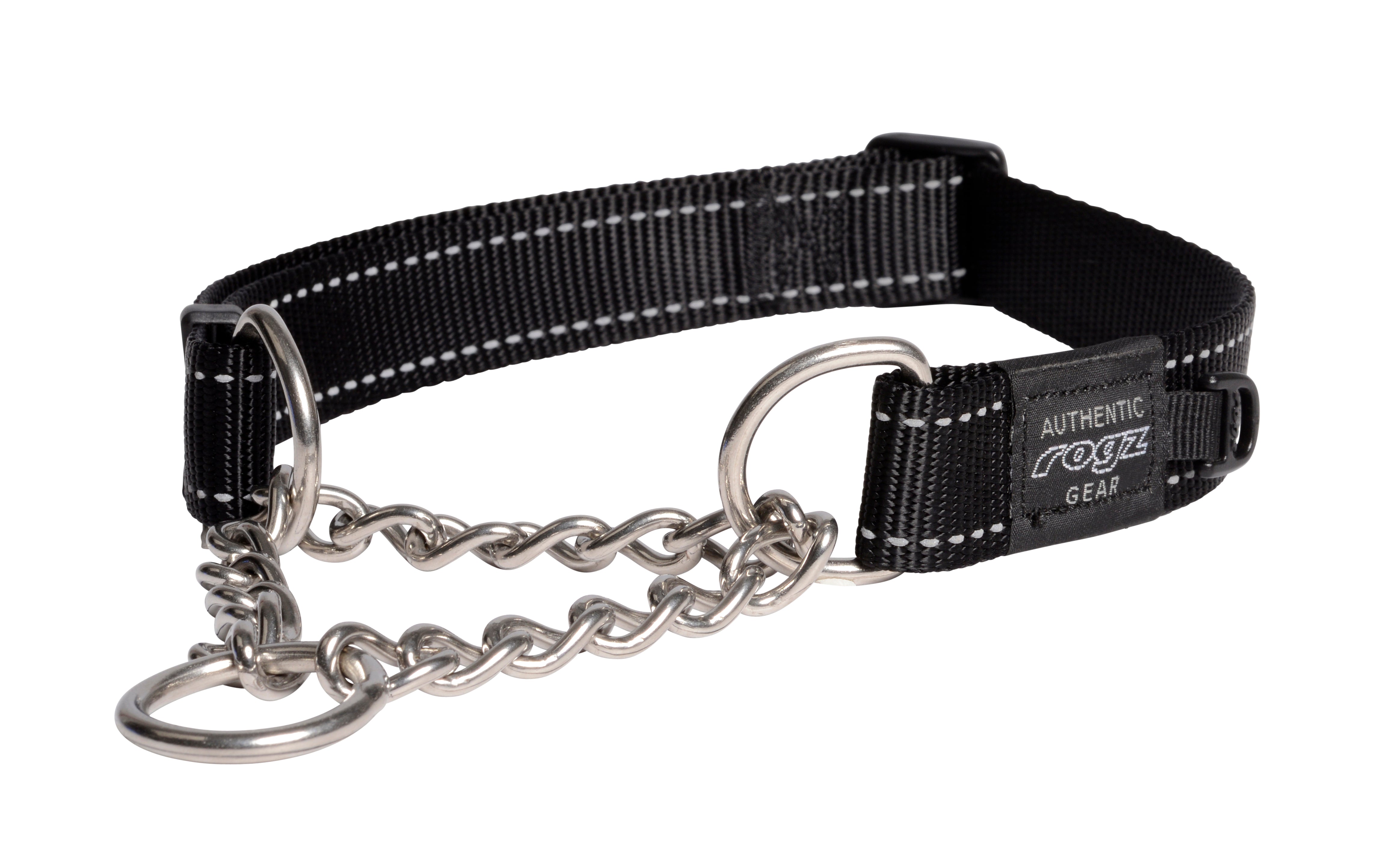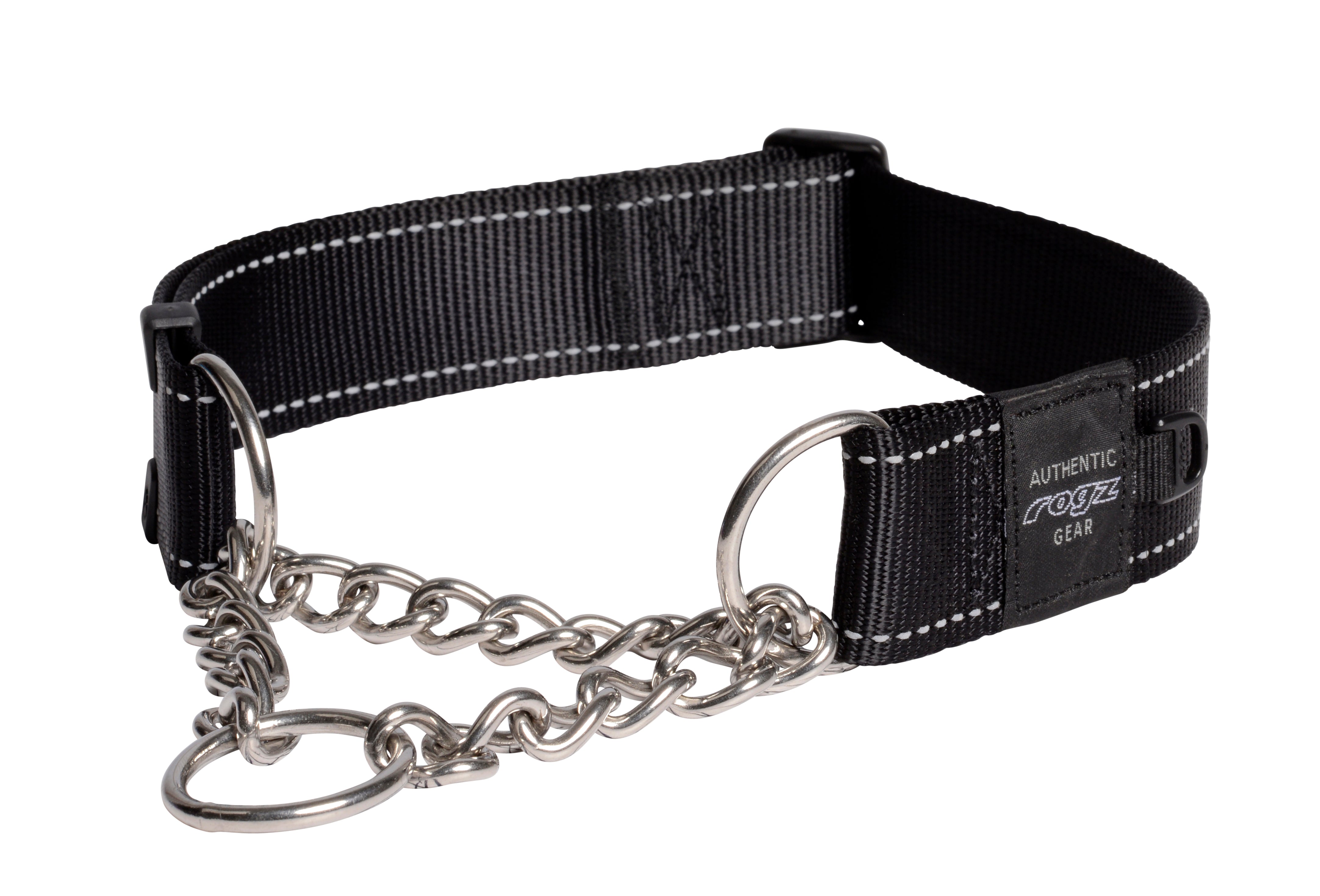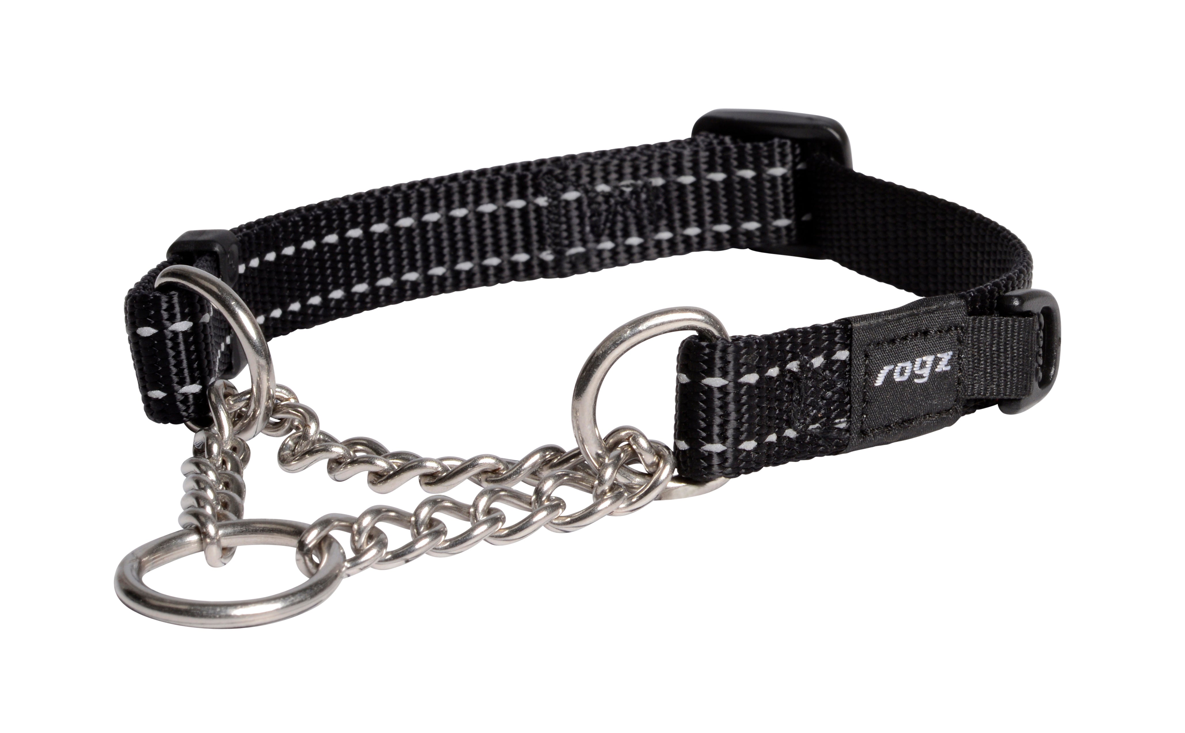 Recommended for behaviour correction and training, Rogz Utility Control Collar Chain are safe and non-slip with the sound and vibration from the rust-proof stainless steel chain, together with gentle pressure applied via the lead, aiding in obedience training. D-rings are drawn together to prevent your dog from reversing out of the collar, ensuring you maintain control. Highly reflective stitching provides safe, night-time visibility and there is an accessory D ring for ID-Tag attachment