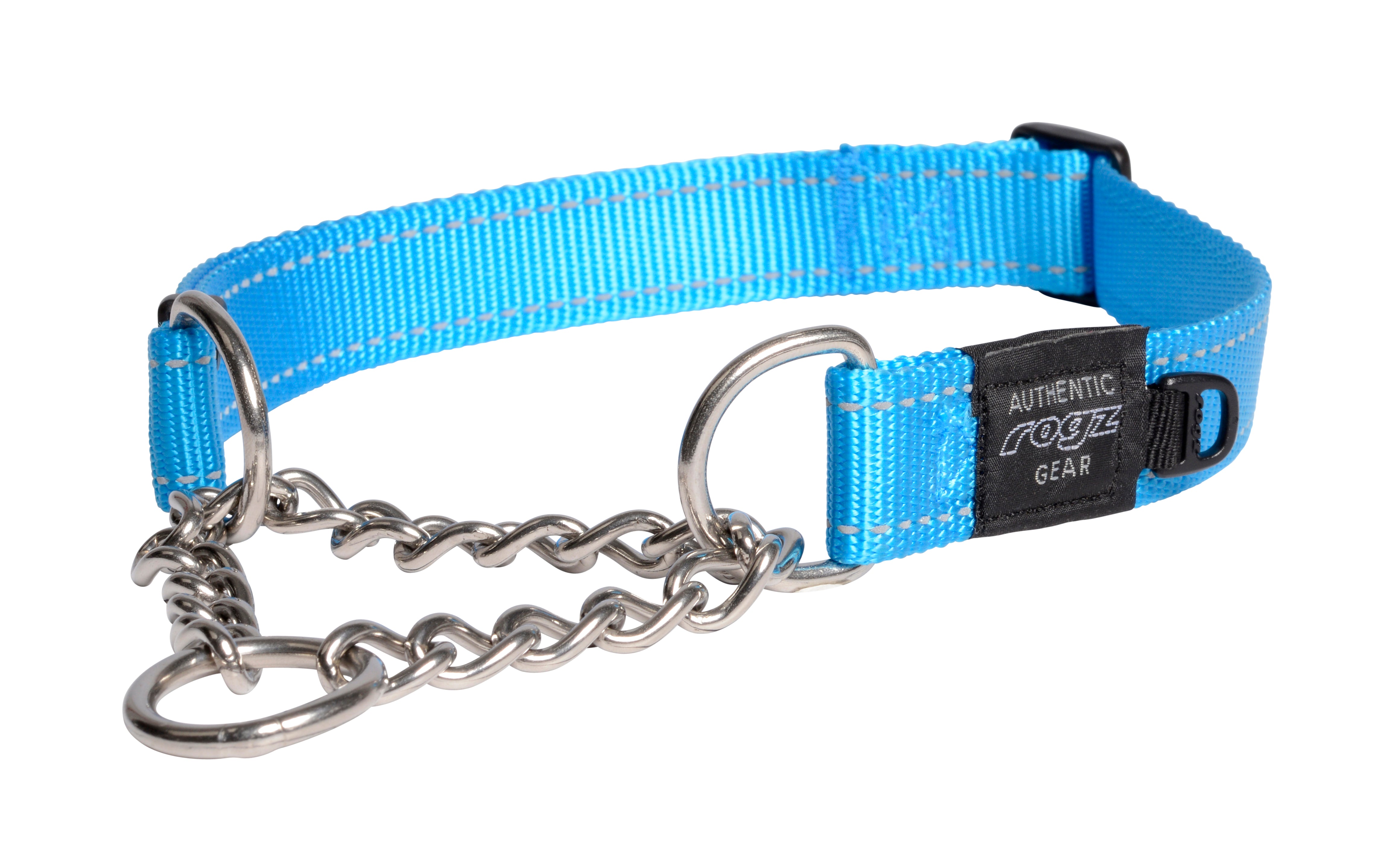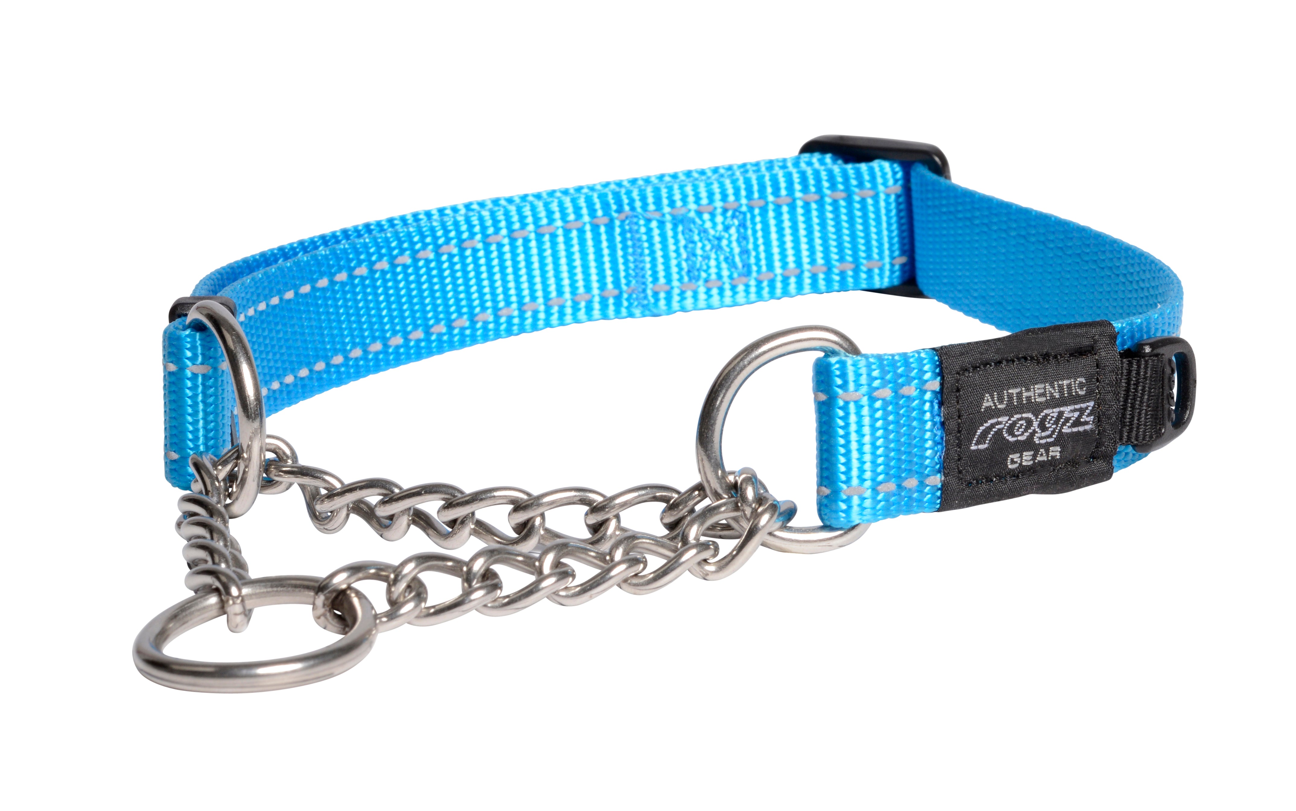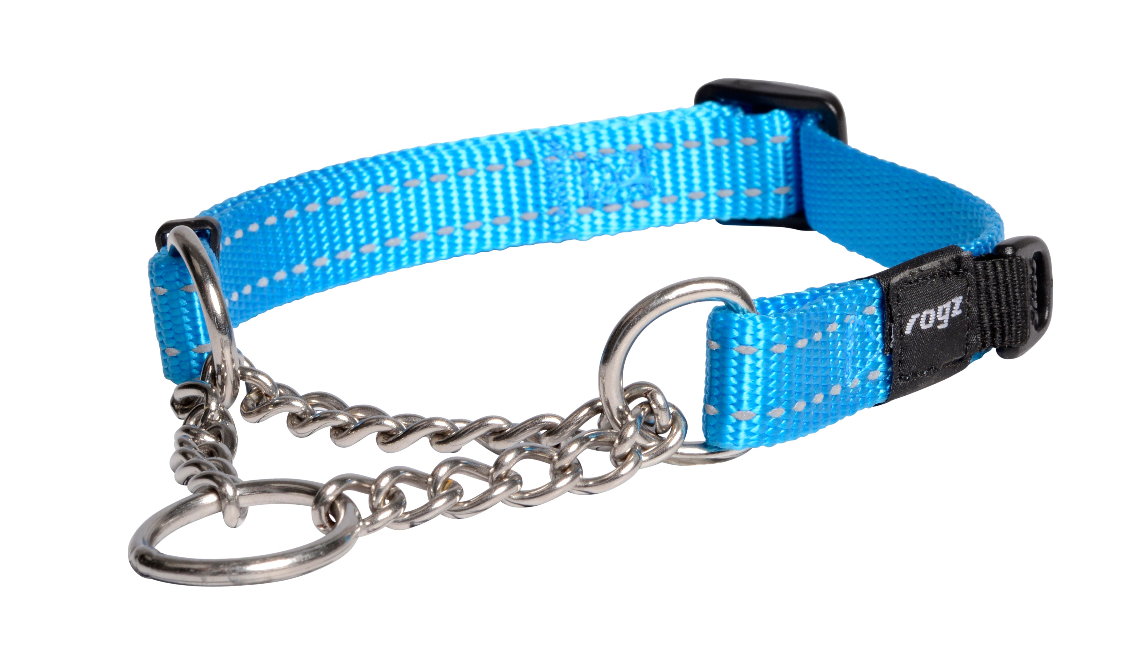 Recommended for behaviour correction and training, Rogz Utility Control Collar Chain are safe and non-slip with the sound and vibration from the rust-proof stainless steel chain, together with gentle pressure applied via the lead, aiding in obedience training. D-rings are drawn together to prevent your dog from reversing out of the collar, ensuring you maintain control. Highly reflective stitching provides safe, night-time visibility and there is an accessory D ring for ID-Tag attachment