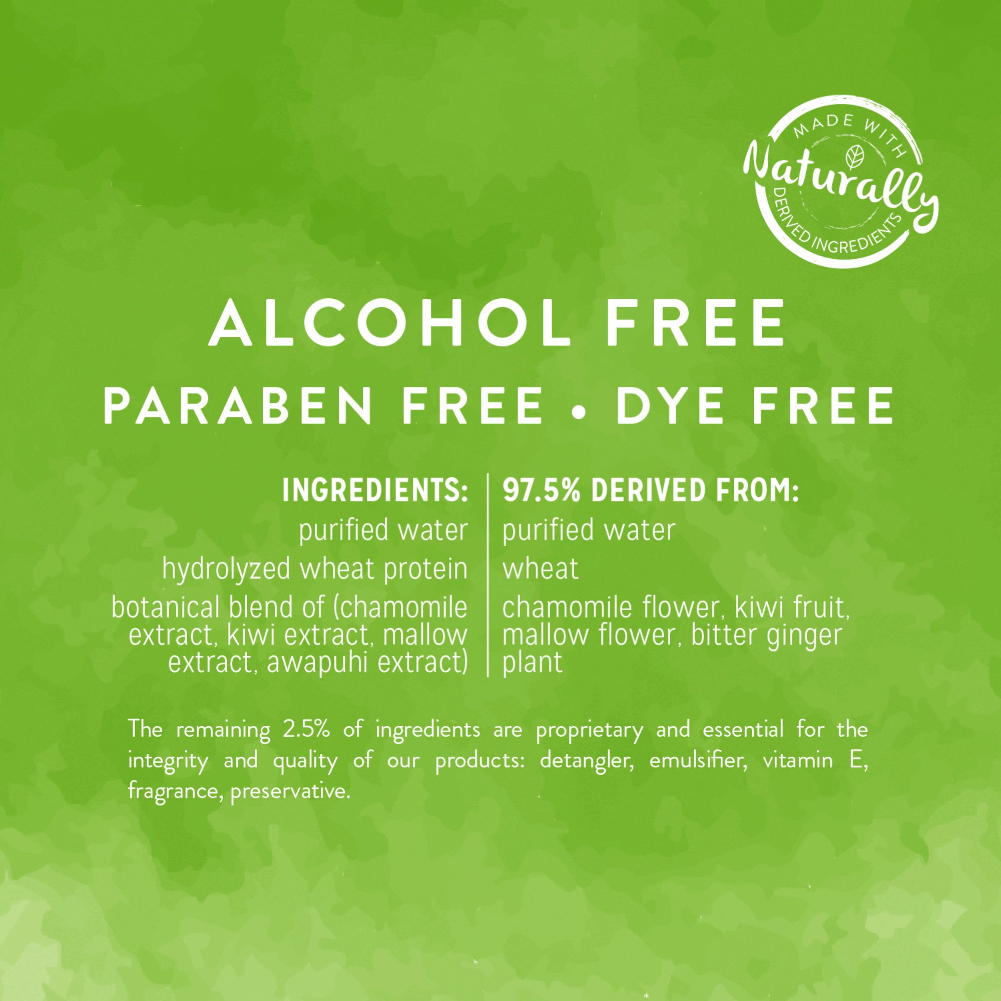 Purified Water, Hydrolyzed Wheat Protein, Botanical Blend Of (Chamomile Extract, Kiwi Extract, Mallow Extract, Awapuhi Extract), Detangler, Emulsifier, Vitamin E, Fragrance, Preservative.