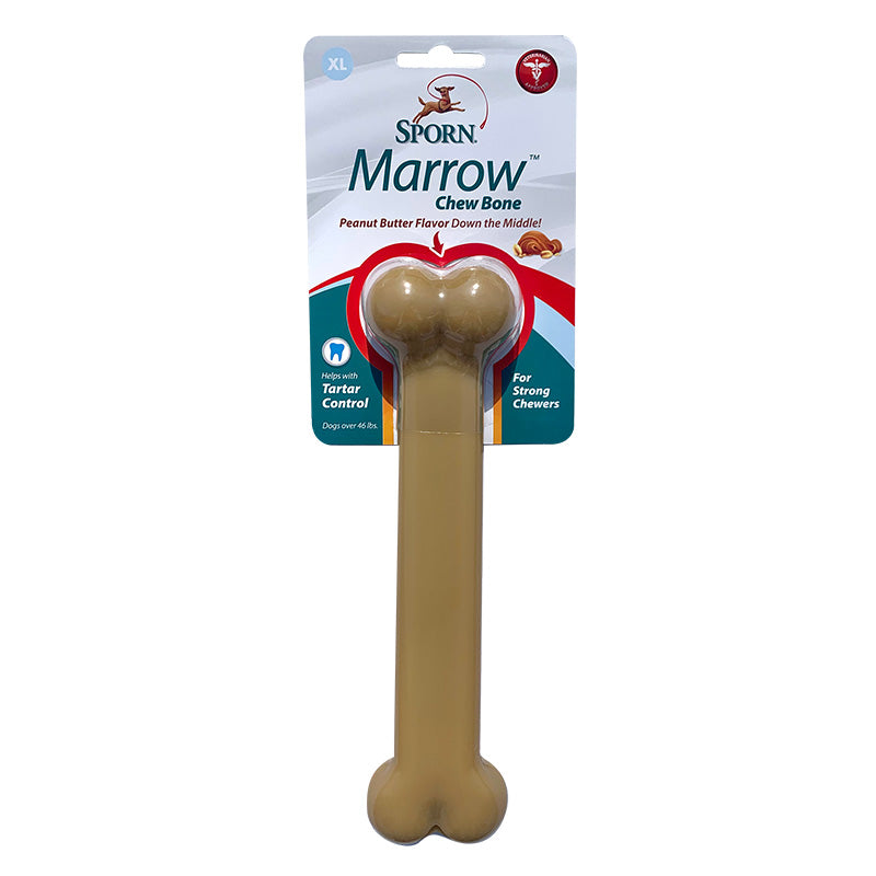 Sporn Marrow Chew Bones are chewable nylon bones with Peanut Butter flavour down the middle! Perfect for strong chewers, nylon shavings act like a toothbrush and help remove tartar from the dog's teeth. Unlike traditional rawhide bones, this bone will last!Chew Bones are available in 5 sizes to suit every size dog. Available in multiple sizes to suit every sized dog.
